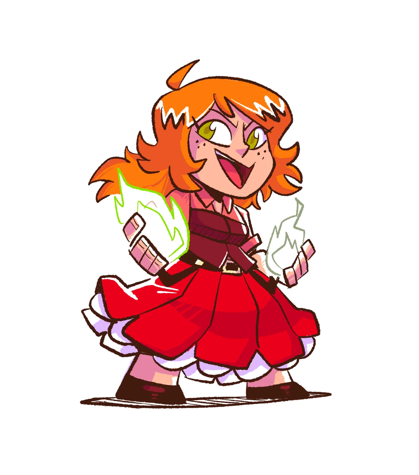 Jeune femme dans la vingtaine aux longs cheveux rouges bouclés et aux yeux noisette vifs. Son caractère est doux et maternel, mais elle sait se révéler redoutable en cas de besoin. Aussi chaude que sa magie du feu, elle collectionne les différentes flammes et les six branches de l’Art pour mieux retrouver sa princesse disparue.